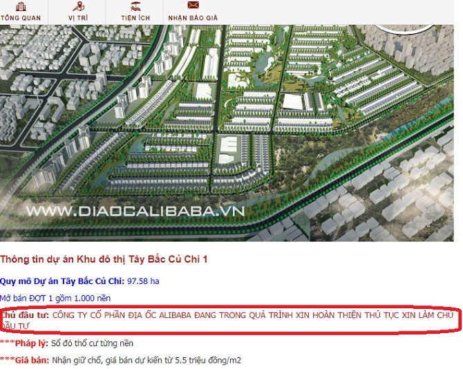 phanh phui tự xưng là chủ đầu tư dự án Tây Bắc Củ Chi. (Ảnh chụp website diaocalibaba.vn)