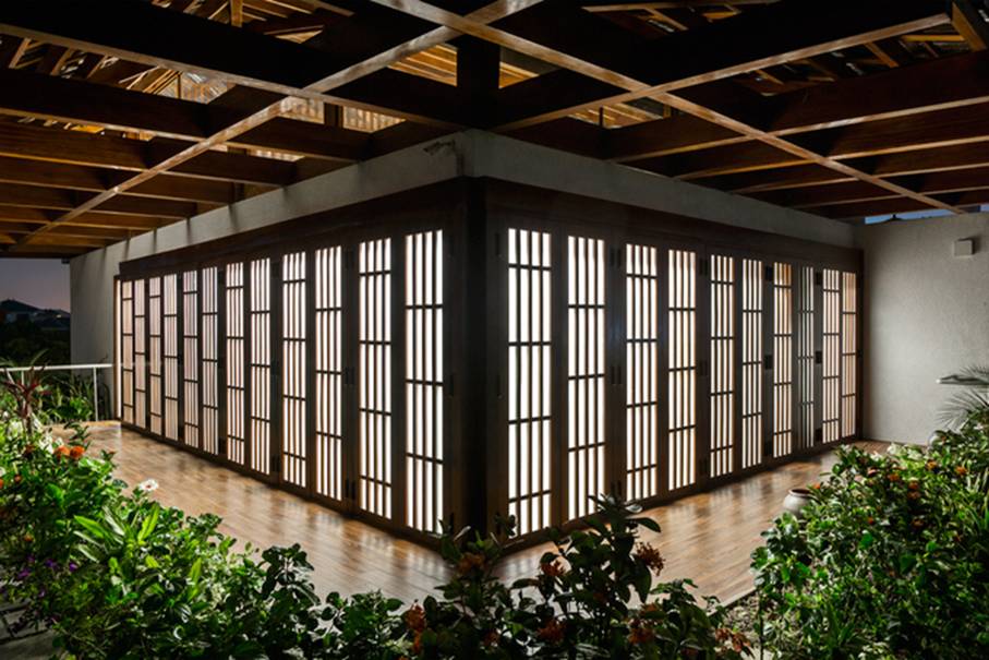 Ngôi nhà là sự giao thoa giữa kiến trúc Nhật Bản và Việt Nam, sử dụng tông màu gỗ trầm kết